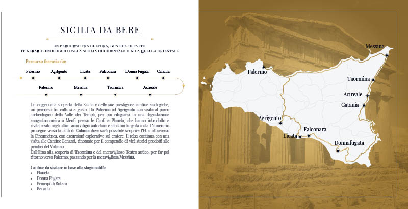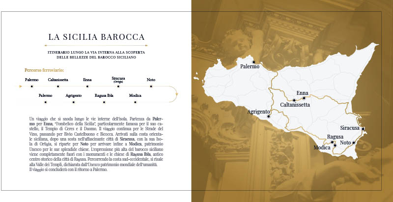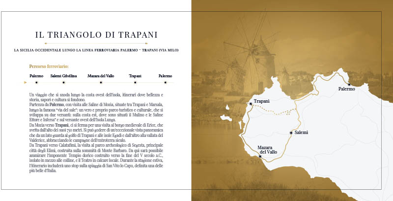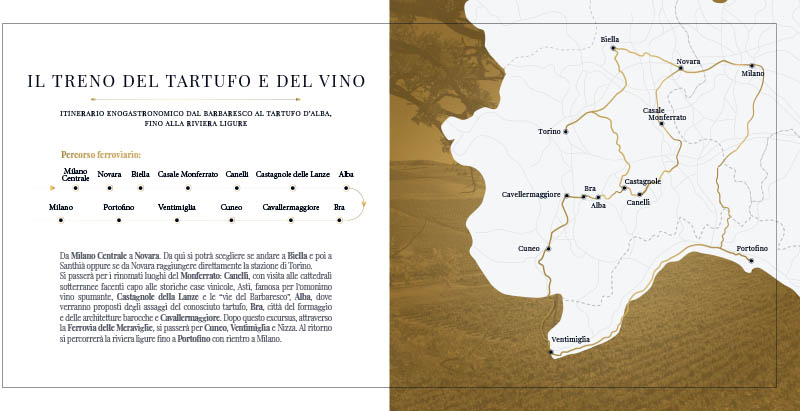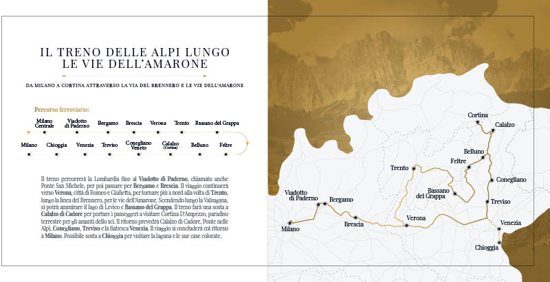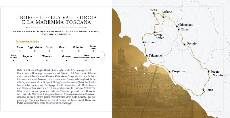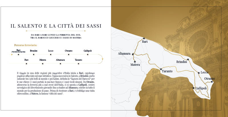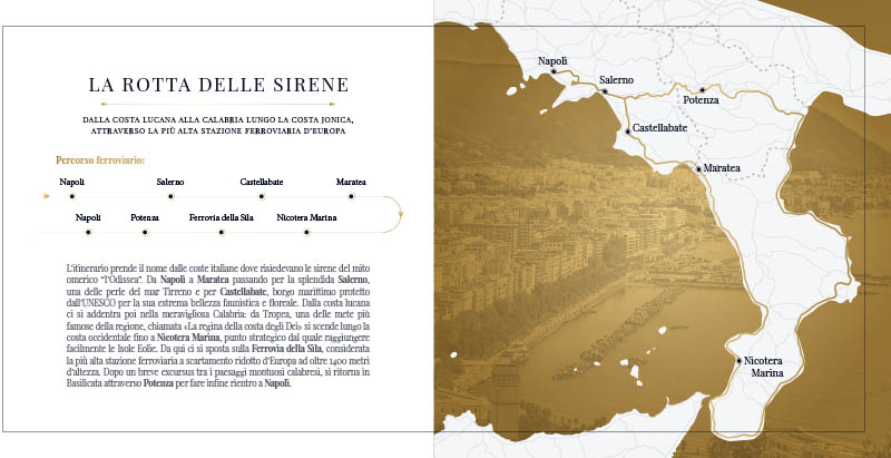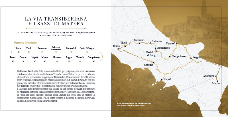 Tesori nascosti racchiusi in itinerari personalizzati che attraverseranno da Nord a Sud la penisola. Percorsi di 1, 2 o 3 notti con tratte riservate e servizi di terra in location esclusive. Il treno percorre diversi itinerari ferroviari attraverso 14 regioni e oltre 128 città.