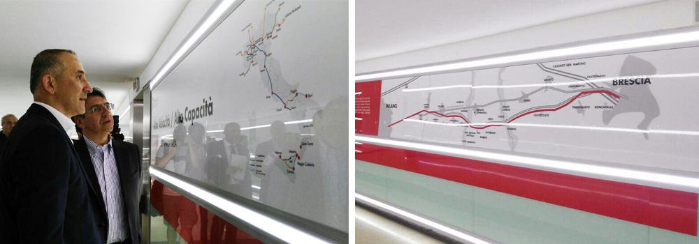 L'altra parete racconta l'intera linea AV Torino - Napoli e le stazioni di Torino Porta Susa, Reggio Emilia AV, Bologna AV, Roma Tiburtina e Napoli Afragola AV.