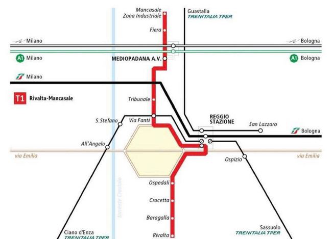 La prima Tranvia di Reggio Emilia – definita linea T1 – collega Villa Rivalta con Villa Mancasale, attraversando centralmente i quartieri con un tracciato di 14,5 chilometri, che connette le zone residenziali a sud con i distretti produttivi e della grande mobilità (ferroviaria e autostradale) a nord.
