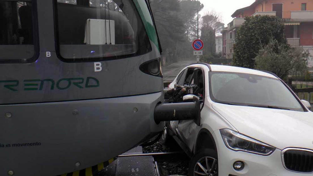 "Oggi alle ore 14.10 un’autovettura ha indebitamente occupato un passaggio a livello nei pressi di Pisogne ed è stata urtata dal treno 1950 (Brescia 13.24-Pisogne 14.36) in transito sulla linea.