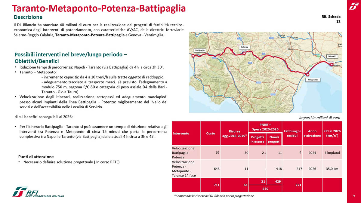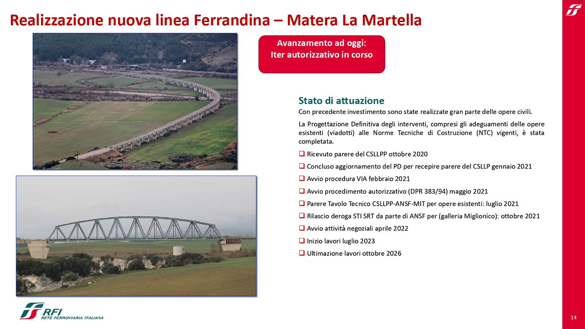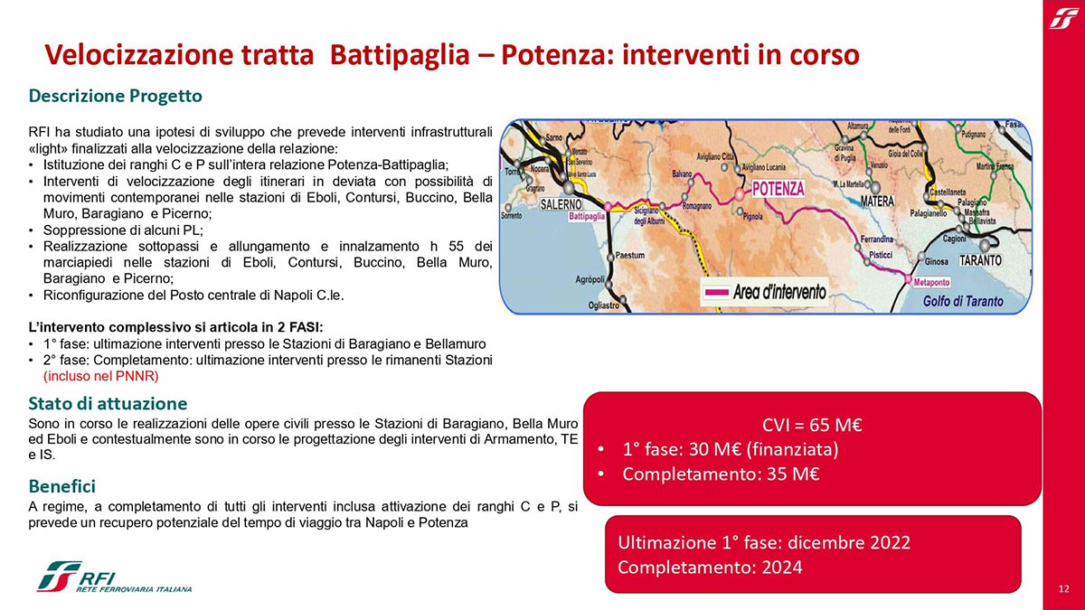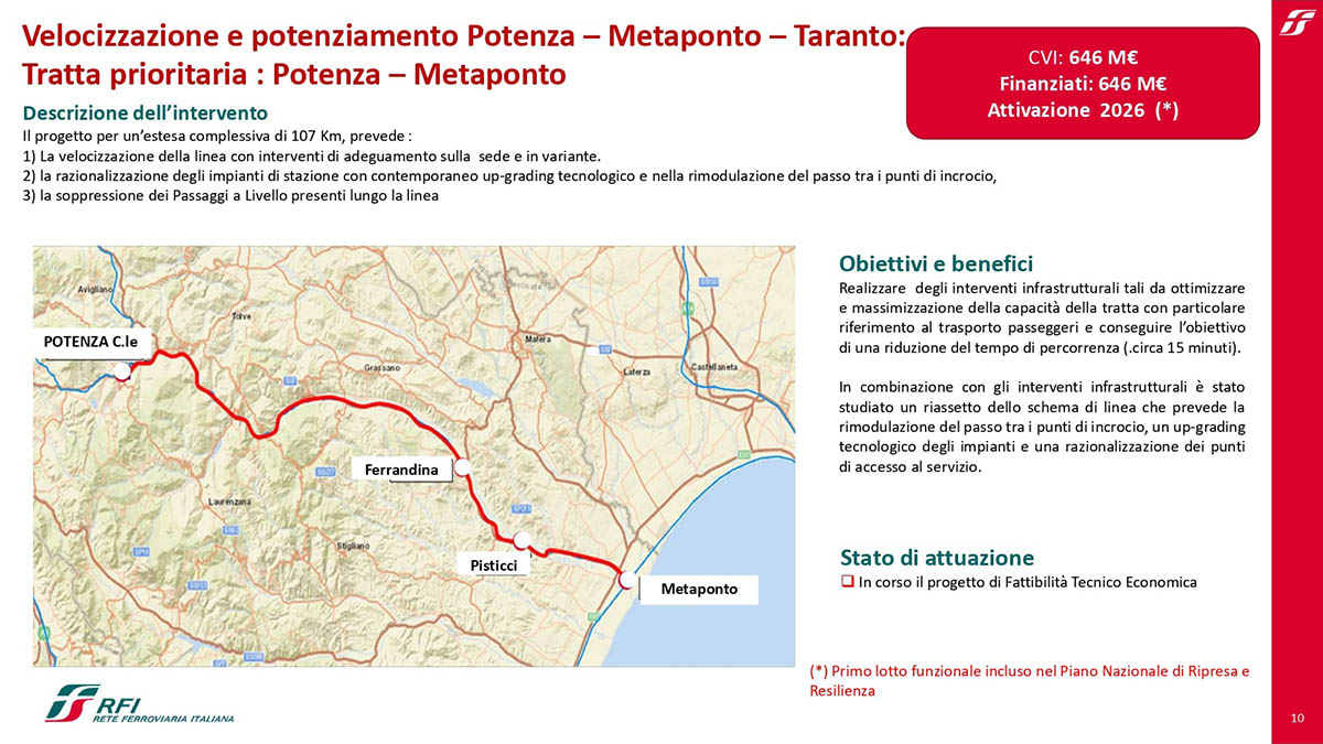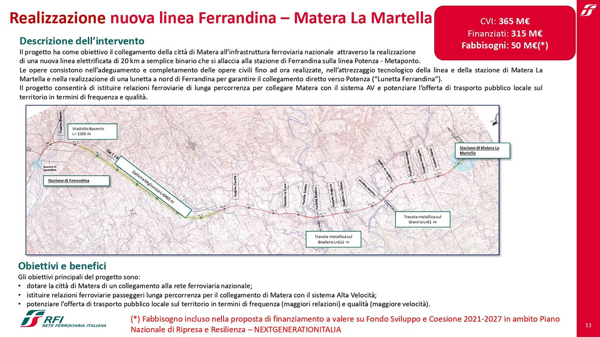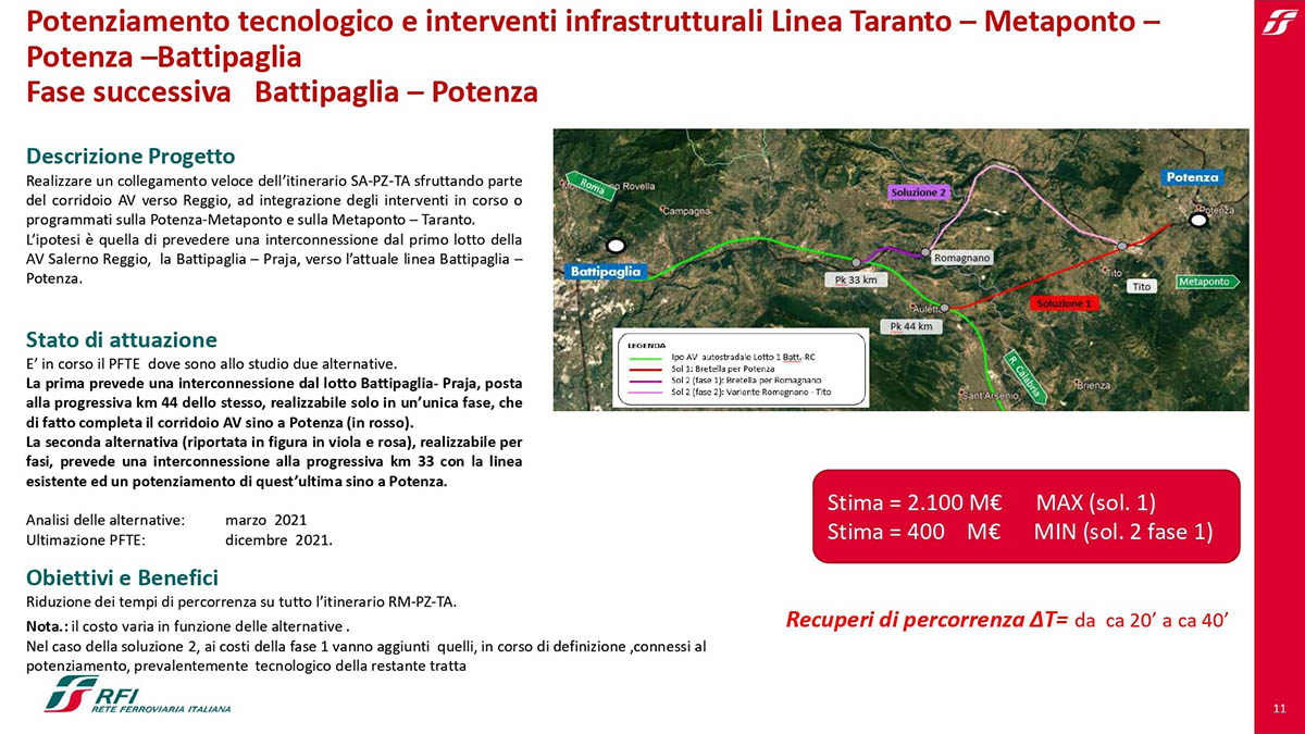 Abbiamo inserito anche le schede riguardanti la velocizzazione della linea Metaponto - Potenza - Battipaglia e del completamento della "eterna incompiuta" linea ferroviaria Ferrandina - Matera "La Martella", che a differenza del progetto originario, prevede (per fortuna) anche una bretella che permette un instradamento diretto in direzione Battipaglia-Salerno oltre a quella in direzione Metaponto, per i treni da/per Matera.
