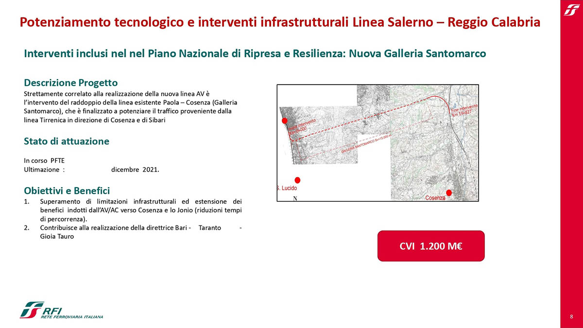 Di questi tre lotti, con il Recovery Plan risulta finanziato solo il raddoppio della Galleria Santomarco che, in ogni caso, non è prettamente definibile parte di una nuova linea AV, ma semmai necessario a migliorare i collegamenti ferroviari tra la linea Jonica in corso di elettrificazione, Cosenza e la Ferrovia Tirrenica Meridionale "storica", a Paola, sulla quale poi proseguire fino a Praja per instradarsi sulla "mini-AV" Praja - Salerno.