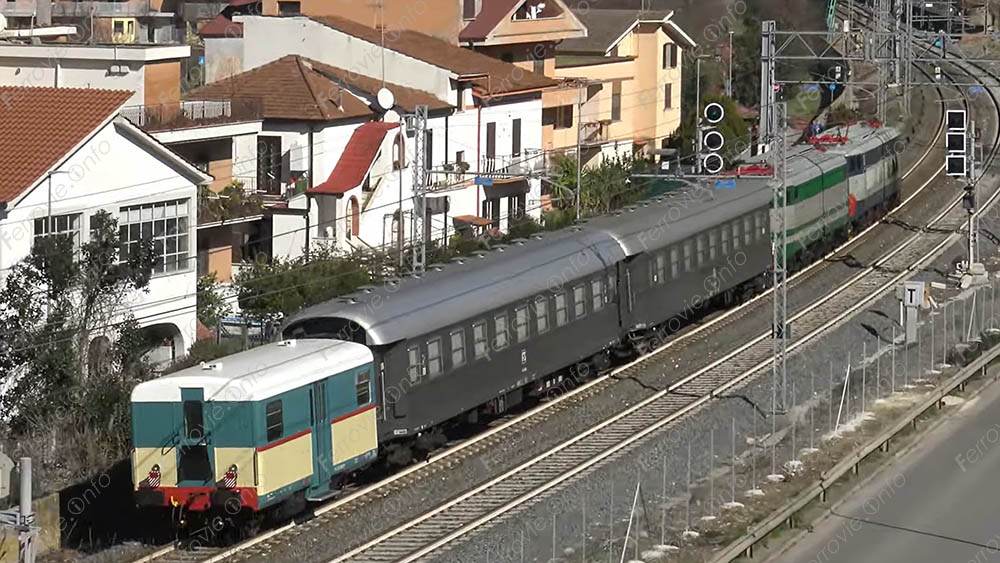 Come visibile nel nostro video, registrato a nord di Roma, la composizione del treno pari ha visto in testa la E.656.590 seguita dalla E.646.196, dalle due vetture e quindi dall'LDn 24.333.