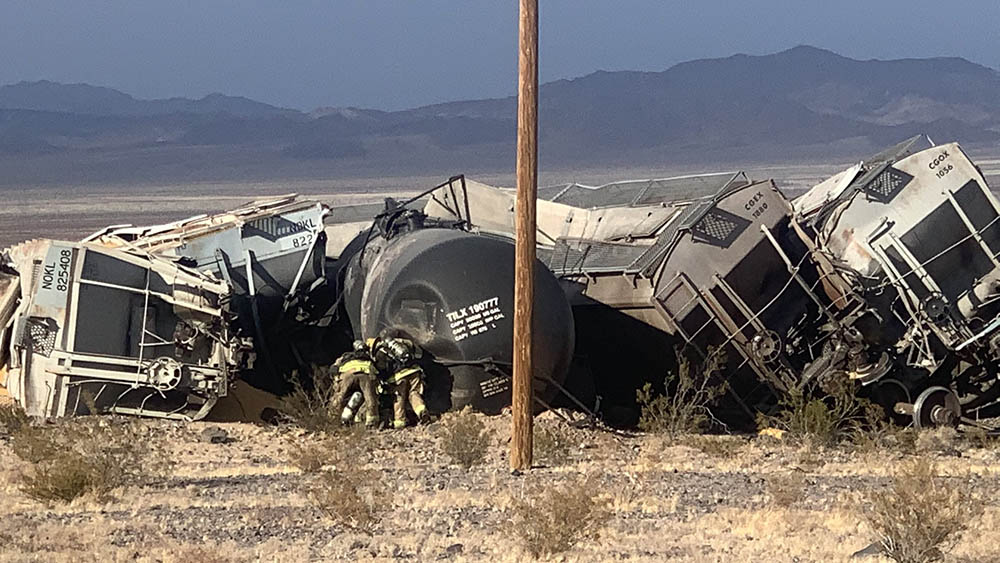 Un treno merci è deragliato nel deserto del Mojave mercoledì pomeriggio causando la fuoriuscita di migliaia di litri di liquido infiammabile da una cisterna prima che si riuscisse a fermare la perdita.