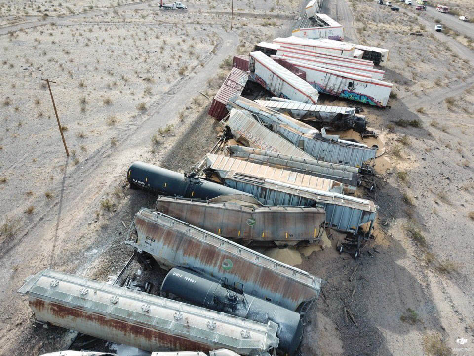 Sono stati coinvolti circa 30 carri merci. Le riprese dei droni antincendio della contea hanno mostrato gli stessi carri ammassati uno di fianco all'altro sulla ferrovia nella remota area desertica.