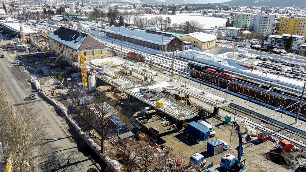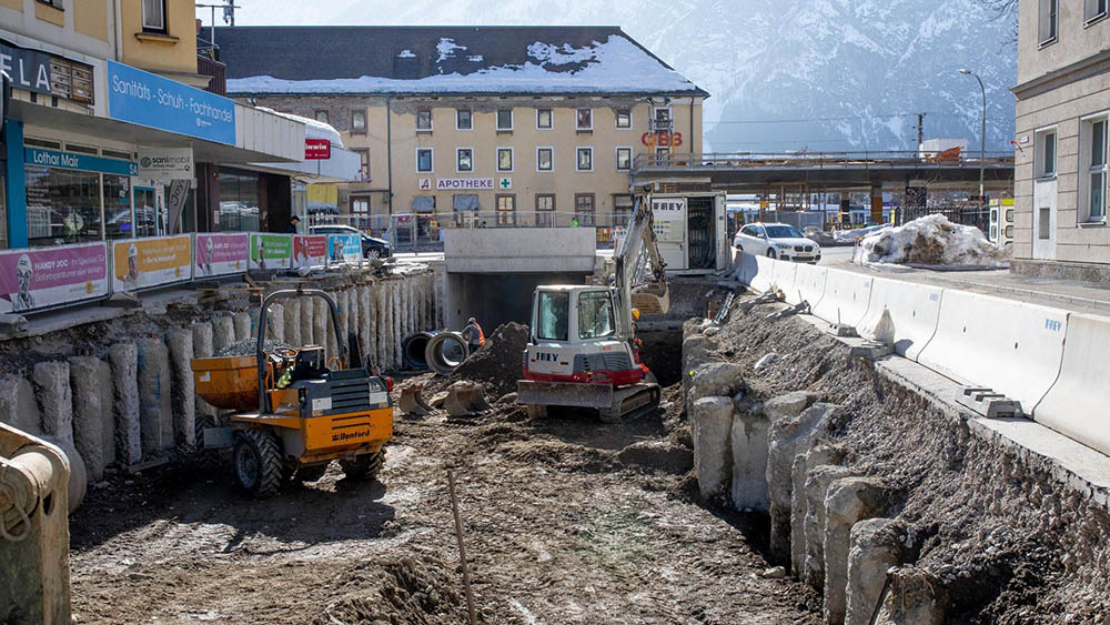 Il fulcro dei lavori di costruzione è attualmente nell’area del nuovo sottopasso pedonale e ciclabile. È attualmente in fase di posa una pietra naturale giallo-verde oliva (“Dorfergrün”), che in futuro modellerà in modo significativo l’immagine del sottopasso. Proviene da una cava del Tirolo Orientale e viene posato su circa 120 metri di sottopasso ciclopedonale – cuore del nuovo centro mobilità – sulle pareti e nella zona pedonale. La rampa sud del sottopasso in direzione di Tristach è già utilizzata dai passeggeri; il guscio della rampa a Bozener Platz è terminato.