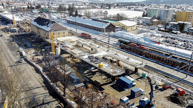 Sono inoltre in corso lavori di costruzione intensiva nell’area dei binari e intorno al piazzale della stazione. Il guscio del nuovo tetto della futura stazione degli autobus è terminato. Sono state ora gettate le basi per l’ampliamento del tetto antistante l’edificio della stazione. Successivamente sarà possibile passare dal treno all’autobus al riparo dalle intemperie.