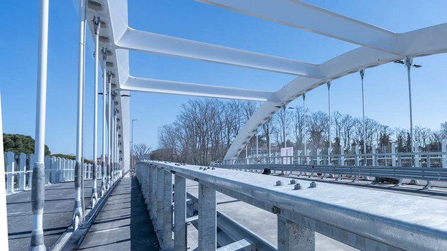 Verniciatura della struttura, posa della pavimentazione stradale e dei guardrail, montaggio dei parapetti in vetro, realizzazione della segnaletica stradale e installazione dell’impianto di illuminazione sono stati gli interventi finali che hanno completato l’opera.