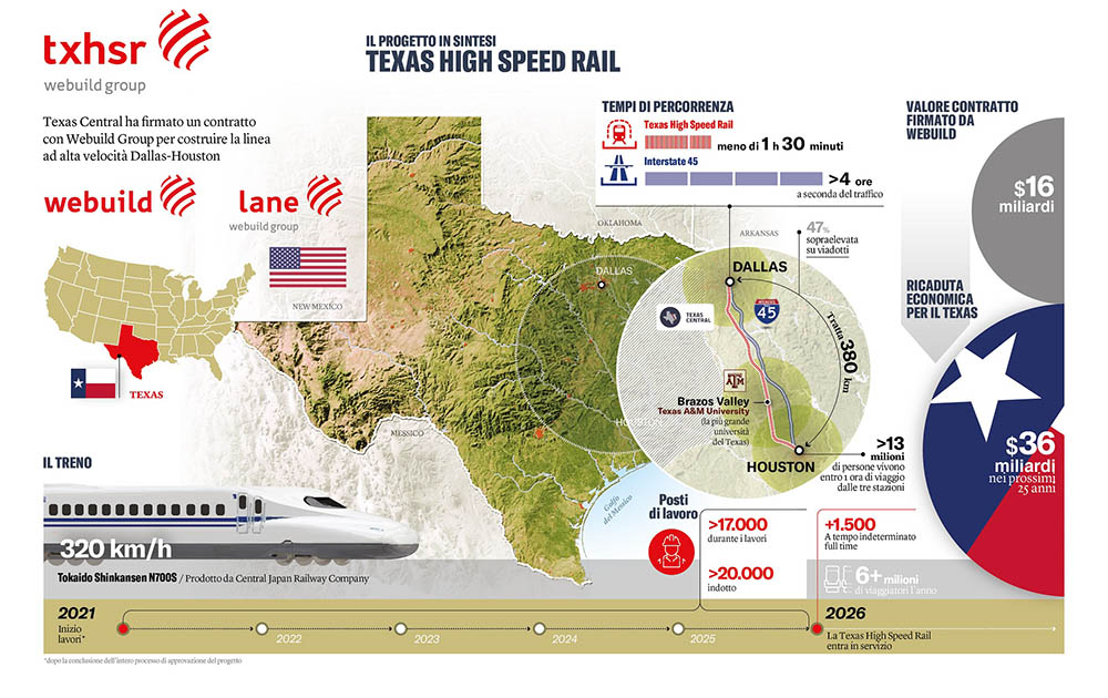 Webuild e la sua controllata statunitense Lane Construction hanno firmato il contratto definitivo del valore di 16 miliardi di dollari con la società Texas Central LCC per realizzare la ferrovia ad alta velocità tra Dallas e Houston.