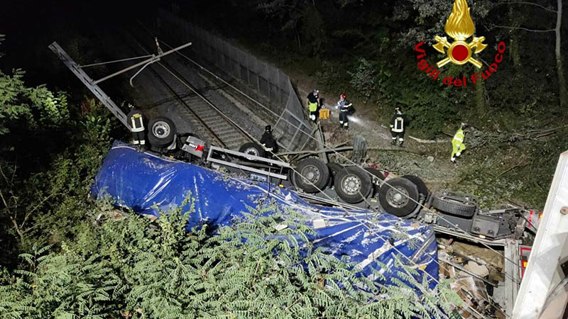 Il pesante mezzo ha proseguito la la sua folle corsa sfondando la balaustra metallica per andare a schiantarsi, ribaltandosi e perdendo gran parte del carico, sulla sottostante linea ferroviaria Foligno-Perugia-Terontola.