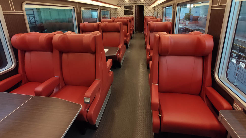 È stato eseguito il restauro completo degli allestimenti interni e riportati allo stato di origine i due moduli di sedili per il servizio di ristorazione a bordo che erano stati eliminati; ripristinato anche l’originale motivo decorativo presente sulla cantinetta e la porta a doppio battente in cristallo presente tra il salone e la cucina, ricostruita in acciaio inox e dotata di elettrodomestici di ultima generazione.