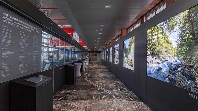 L'area espositiva si trova nella parte sud della galleria rialzata. Nel contesto di questa mostra interattiva, ogni tre mesi si presenta una nuova tematica. Il grande numero di temi del progetto offre svariate possibilità di mostrare contenuti sempre nuovi: dallo stato attuale di avanzamento dei lavori nello scavo della galleria mediante frese meccaniche all'asse ferroviario Monaco - Verona.