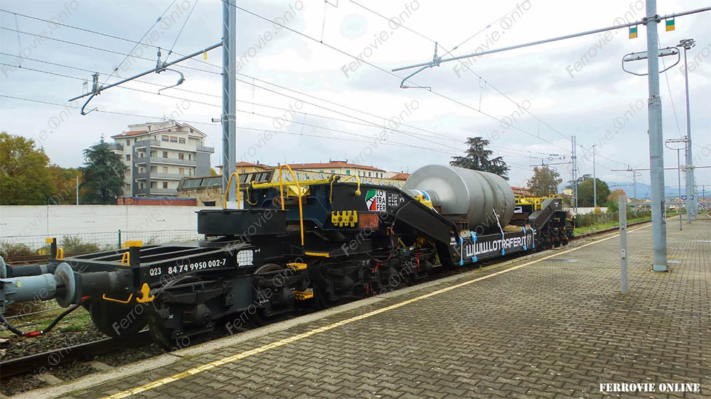 Con foto e video del canale Ferrovie Online, vediamo il treno mentre limitato a 30 km/h giunge a Firenze Campo Marte da Terni, con il volano caricato su un mastodontico carro da 10 assi.