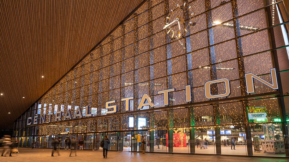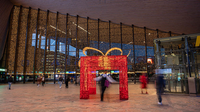 Proprio per questo motivo, nei Paesi Bassi, Rotterdam Central è stata allestita con migliaia di luci su un chilometro di cavo che illuminano la facciata e l'atrio della stazione.