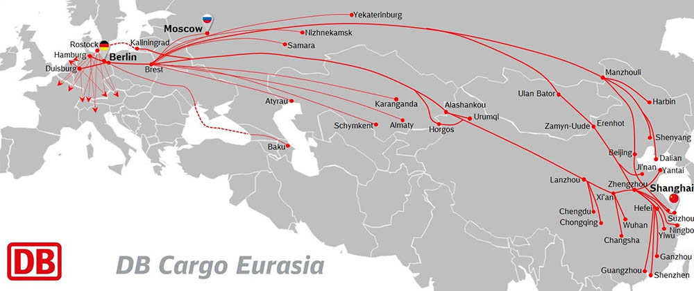 L'attrattiva del percorso ferroviario continuerà ad aumentare. I trasporti sul corridoio transeuroasiatico sono significativamente più veloci rispetto alle navi portacontainer e costano solo un decimo del trasporto aereo comparabile. DB ha aperto quest'anno diverse nuove rotte tra la Cina e l'Europa, più recentemente il nuovo collegamento Shanghai - Amburgo - Shanghai alla fine di settembre. DB Cargo Eurasia gestisce attualmente il traffico su più di dieci rotte.
