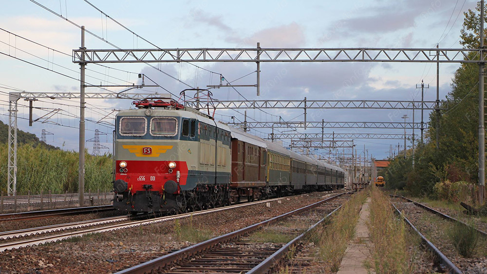 Lo speciale si è svolto oggi con un bellissimo treno composto da carrozze grigio ardesia trainate dalla E.656.001 nella splendida livrea d'origine Blu Orientale e Grigio Perla.