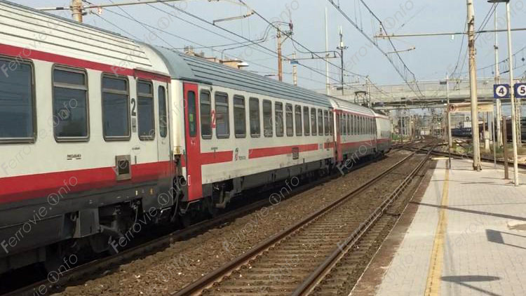 Nella giornata di ieri sul Frecciabianca 8810 proveniente da Bari Centrale e diretto a Milano Centrale, era presente in composizione una vettura in cromia Intercity Giorno.