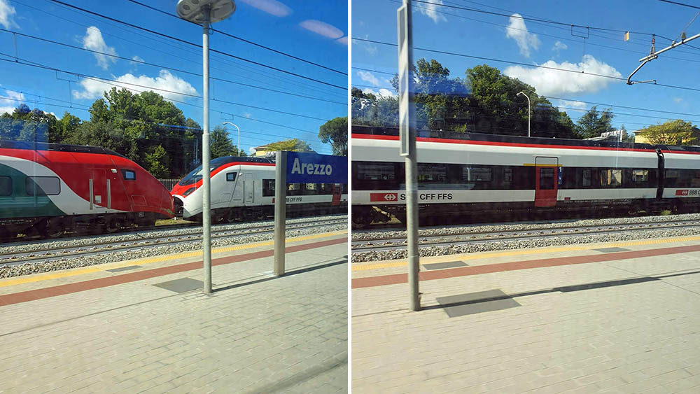 Le foto di Kevin Salerno ci permettono di vedere i due treni accoppiati nella stazione toscana, con uno dei due in livrea dedicata Italia/Svizzera e l'altro in cromia classica SBB.