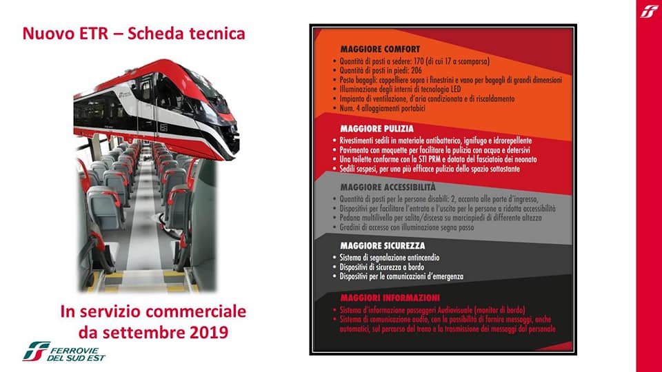 Il nuovo ETR 322 è dotato di spazi portabici, di ogni confort per le persone a ridotta mobilità, oltre che di un impianto di videosorveglianza per la sicurezza dei passeggeri e impianto di climatizzazione e di sonorizzazione. Inoltre potrà viaggiare a una velocità massima di 120 km/h, così quando sarà completato il potenziamento tecnologico della linea e si potrà superare il limite di velocità di 50 km/h, gli attuali tempi di viaggio verranno ridotti del 40%.