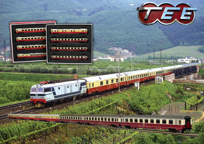 Riproposto in maniera differente il TEE Mediolanum, stavolta con anche il rinforzo delle carrozze Eurofima DB, che nella foto reale viene mostrato con una splendida E.633 in testa mente del tutto nuovo per la casa è l'Apfelpfeil, la Freccia della Mela che veniva regolarmente nel nostro paese con un itinerario che toccava Ancona - Bologna - Verona - München - Mainz - Koln - Duisburg - Wesel - Bocholt. Un treno decisamente bello e importante che viene proposto addirittura in nove carrozze con differenti cromie come al vero, verde e giallo e arancione.