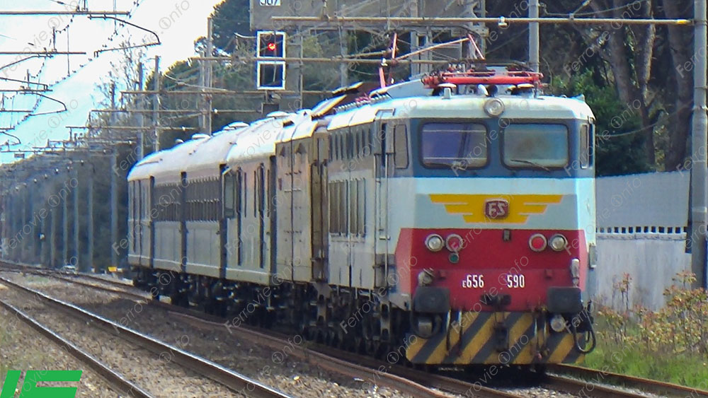 Titolare dell'invio che ha percorso la via Formia fino a Roma e quindi, ovviamente, la Tirrenica fino a La Spezia, la E.656.590 in livrea Grigio Perla e Blu Orientale, seguita appunto dalla E.636.164 in Castano e Isabella e quindi dalle vetture in Grigio Ardesia.