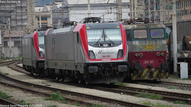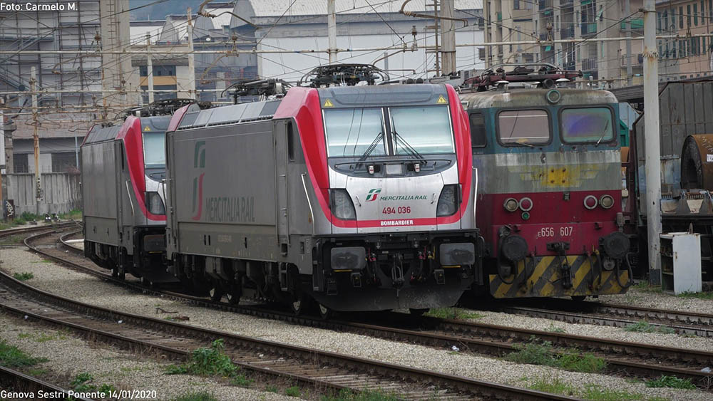 Nella foto di Carmelo Mulé, la vediamo in sosta a Genova Sestri Ponente di fianco ad alcune nuovissime 494 di Bombardier, in una posa che permette di confrontare 30 anni esatti di evoluzione delle locomotive in Italia.