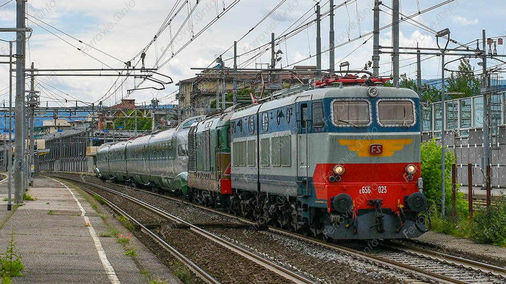 Nella tarda serata, a ridosso del tramonto, è infatti sceso a Roma Termini da Pistoia l'ETR 252 "Arlecchino", con un treno che vedeva in testa la E.656.023 coadiuvata dalla D.445.1011 come visibile nelle due foto di Giovanni Gardenghi.