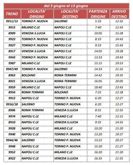 L'azienda nelle scorse ore ha rilasciato la tabella con quelli che sono i collegamenti esatti che viaggeranno dal 3 al 13 giugno.