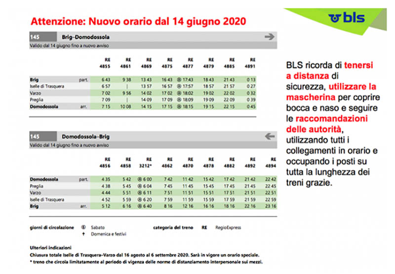 Il presente orario sarà valido fino alla ripresa del traffico viaggiatori internazionale tra la Svizzera e l’Italia, comunque almeno fino al 28 giugno 2020. La BLS segnala ai viaggiatori che in Italia vige l’obbligo di indossare le mascherine sui mezzi pubblici.