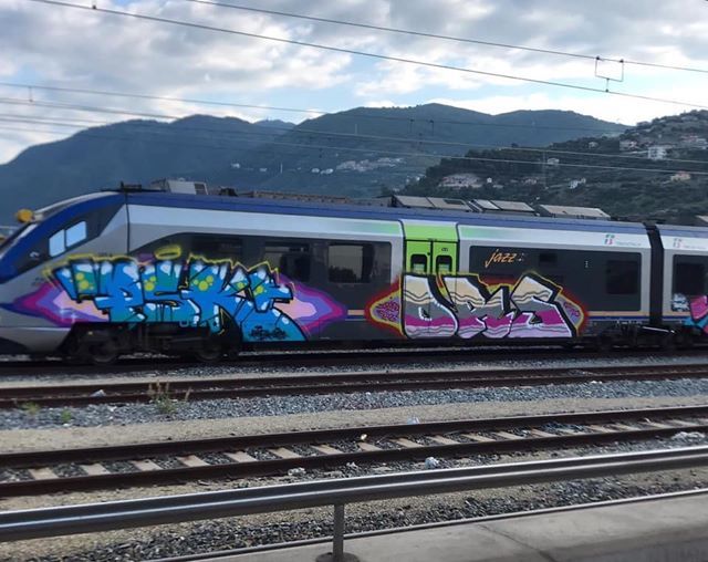“Stazione di #Taggia. In attesa del Regionale per #Genovaprincipe ammiro l’opera d’arte di #Amer2020 che non avendo nulla di utile da fare né per sé né per la società, ha pensato bene di imbrattare uno degli ultimi Jazz acquistati per la nostra Regione».