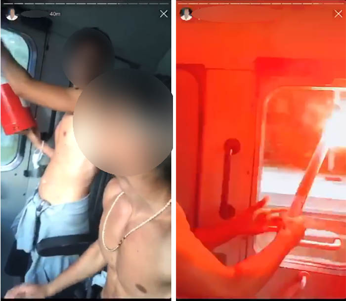 A dare l’allarme una donna che li ha visti dalla banchina della stazione mentre il treno viaggiava. I due hanno acceso un estintore e poi lo hanno gettato dal finestrino e in seguito hanno dato fuoco a delle torce.