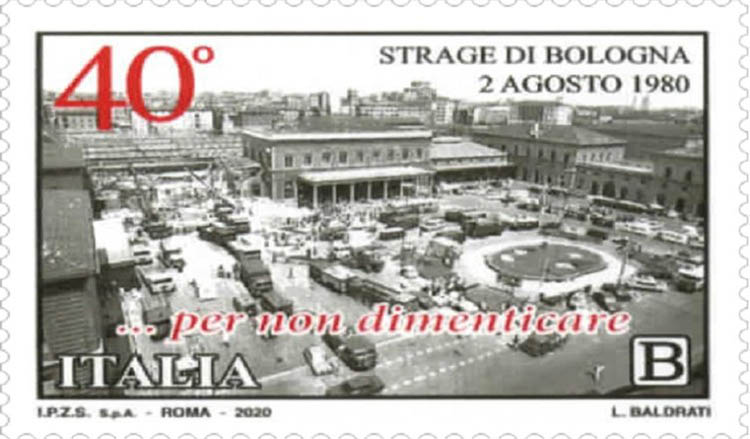 Poste Italiane ha reso noto che dal 2 agosto 2020 viene emesso dal Ministero dello Sviluppo Economico un francobollo ordinario appartenente alla serie tematica “il Senso civico” dedicato alla Strage di Bologna, nel 40° anniversario, relativo al valore della tariffa B pari a 1,10€.