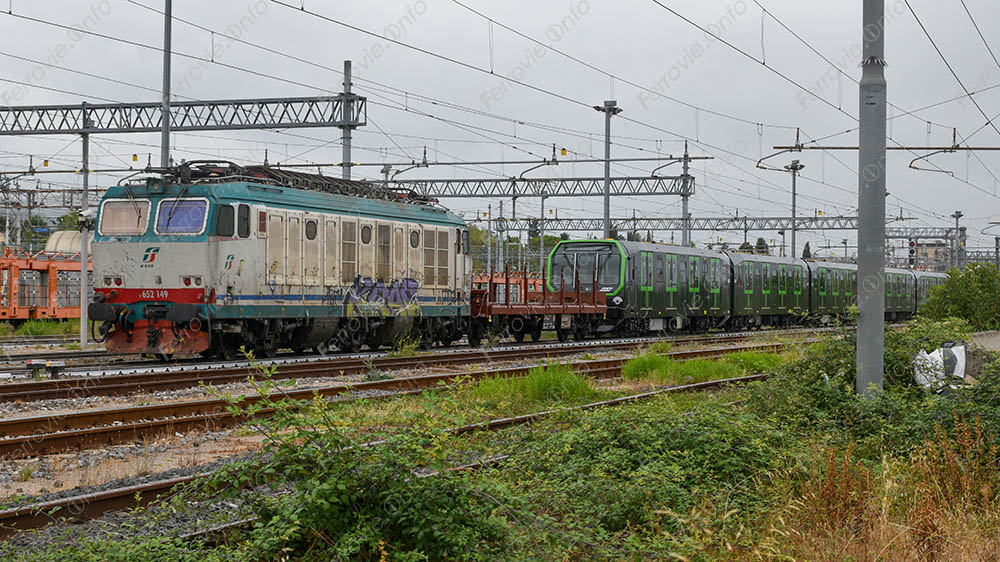 In questo caso la titolare è la E.652.149 in XMPR che come sempre aveva dietro un carro scudo con un secondo identico situato in fondo al convoglio.