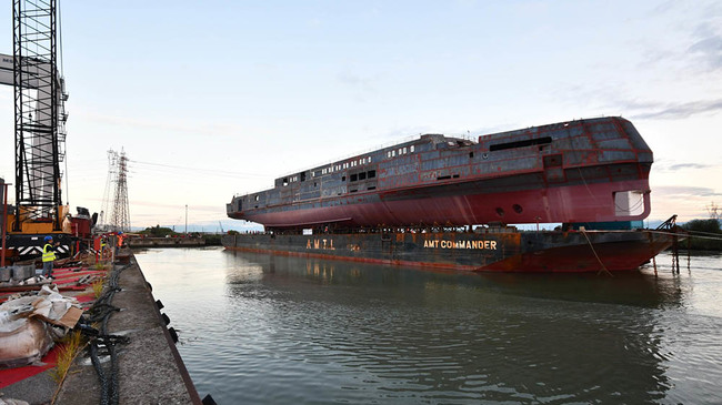 Il galleggiamento dello scafo di circa 3.100 tonnellate è stato preparato con la predisposizione delle manovre in banchina e le analisi sottomarine con georadar a scansione, mentre la fase operativa del varo, a cui hanno preso parte Carmelo Rogolino, Daniele Allegra e Adriana De Luca per RFI e Marco Ghiglione per l’ATI, ha visto l’ausilio di carrelli semoventi SPMT (Self-Propelled Modular Transporter) combinati in 160 assi e della chiatta oceanica semisommergibile AMT Commander della Augustea, grande quanto un campo da calcio e in grado di effettuare una semi-immersione di circa 13 metri.