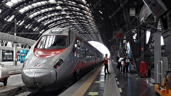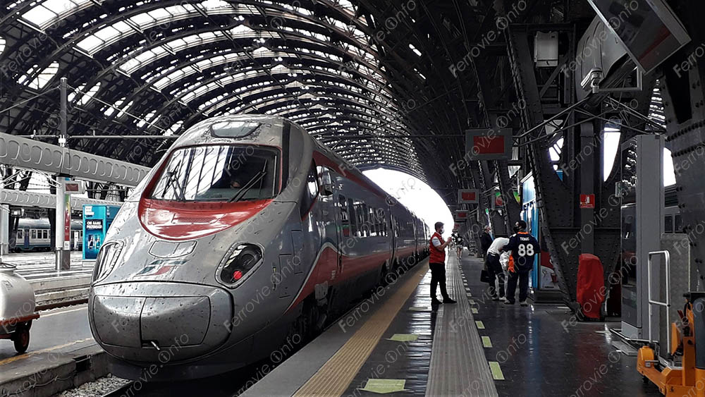 Nella stazione di Bellinzona attendo l'Eurocity 317 Zurigo-Milano, previsto in arrivo alle 12:59. Il treno giunge in orario al binario 2 ed è una doppia composizione di ETR 610 di Trenitalia (ex-Cisalpino). Il convoglio è composto da due treni ETR 610 in comando multiplo e può ospitare fino a 860 passeggeri in prima e seconda classe.