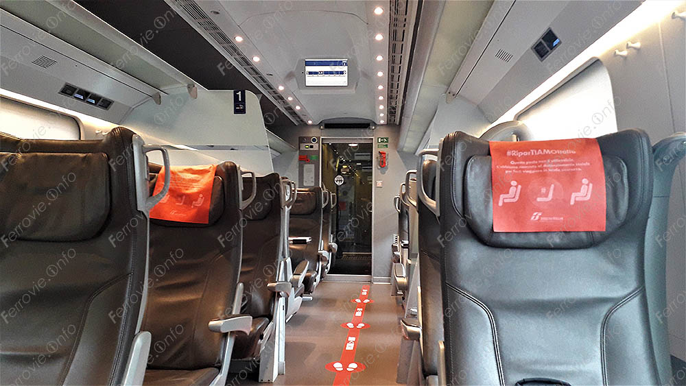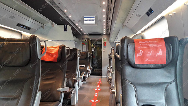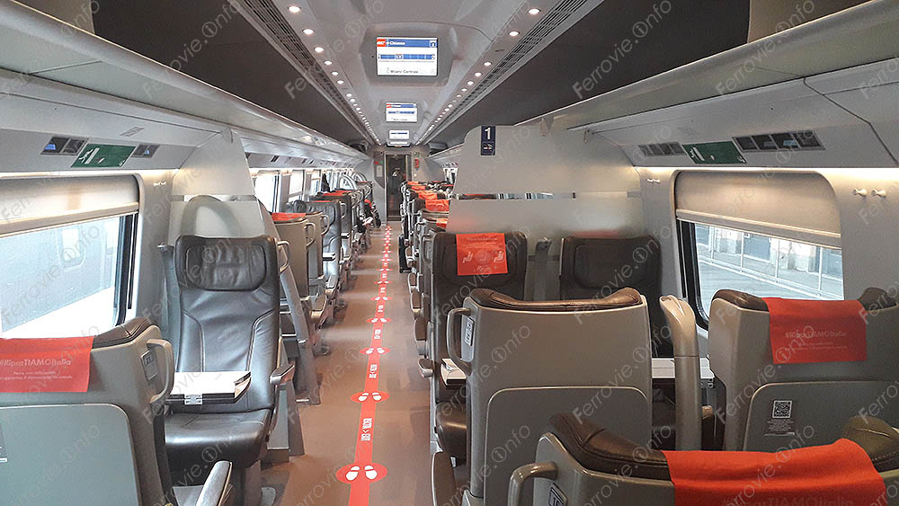 Una volta salito sul treno prendo posto in vettura e si nota subito una grossa differenza in termini di ambienti interni, con l'ETR 610 che presenta uno spazio meno luminoso e più spoglio, con colori leggermente freddi e, in generale, un allestimento meno ricco rispetto al Giruno.