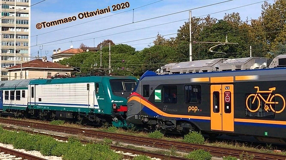 Come avevamo anticipato, nella stazione romagnola è presente una insolita composizione che prevede due E.464 alle estremità con altrettante vetture Medie Distanze intercalate.