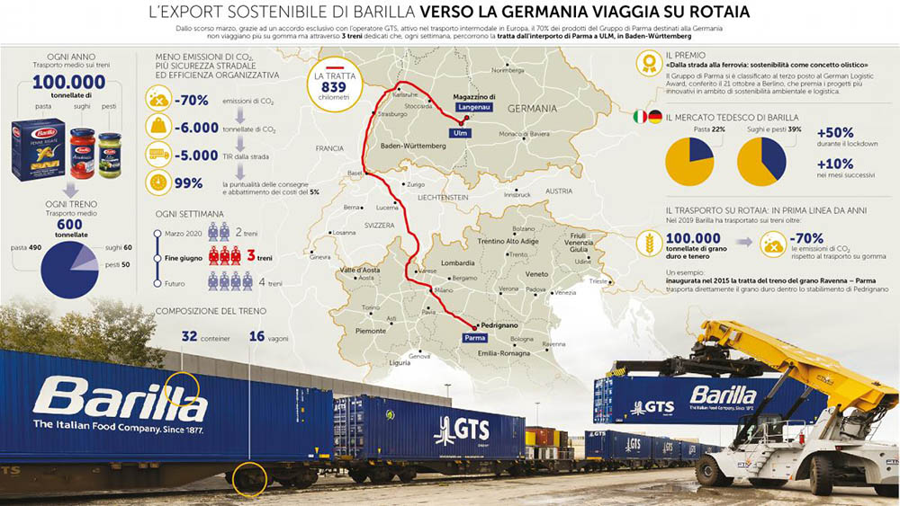 Dallo scorso marzo il 70% dei prodotti del Gruppo di Parma destinati alla Germania - circa 100.000 tonnellate ogni anno tra pasta, sughi e pesti - viaggiano sui treni, invece che su gomma, attraverso l’innovativa linea ferroviaria che collega l’interporto di Parma con quello di ULM in Baden-Württemberg. Appena pochi chilometri dopo arrivano nel magazzino di Langenau, consentendo così un notevole risparmio dal punto di vista dell’impatto ambientale e anche una migliore efficienza organizzativa.