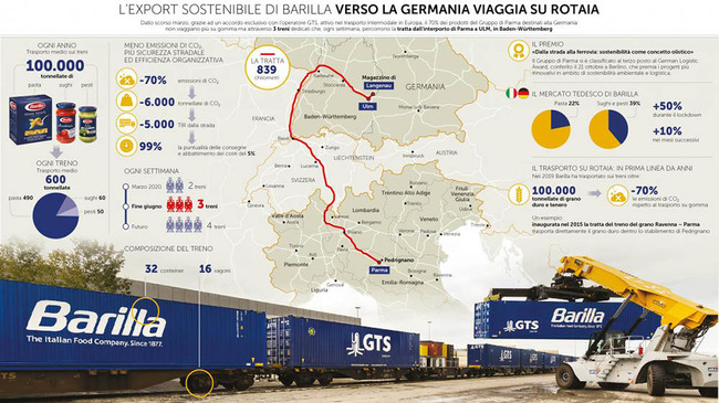 Il Gruppo Barilla ha avviato una nuova modalità di trasporto sostenibile dei propri prodotti alimentari dall’Italia alla Germania, grazie ad un accordo esclusivo con l’operatore GTS, attivo nel trasporto intermodale in Europa.