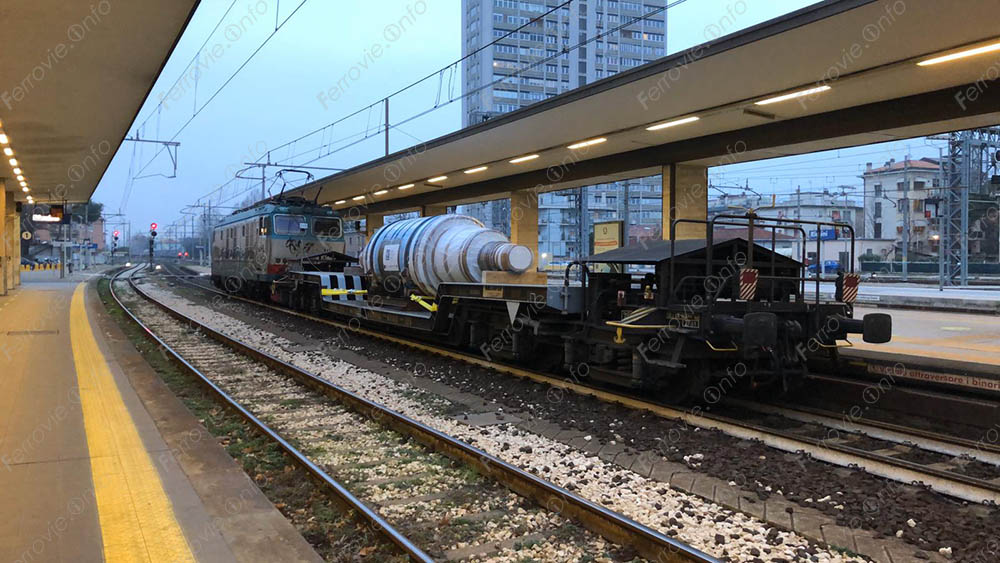 Il pesante manufatto è stato trasportato sul carro Tipo Uaais 37 55 994 5 001-8 caratterizzato da ben otto assi, il tutto trainato dalla E.652.032 di Mercitalia Rail in livrea XMPR.