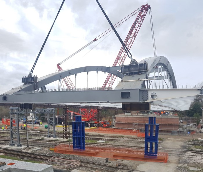 La struttura metallica, del peso di circa 400 tonnellate, è stata inizialmente sollevata con l'ausilio di martinetti e successivamente posata su speciali carrelli ribassati, per avvicinarla ai binari. Sono entrate poi in azione le due gru già posizionate alle estremità del futuro cavalcaferrovia. I mezzi hanno dapprima sollevato e poi posato il futuro ponte nella posizione definitiva.