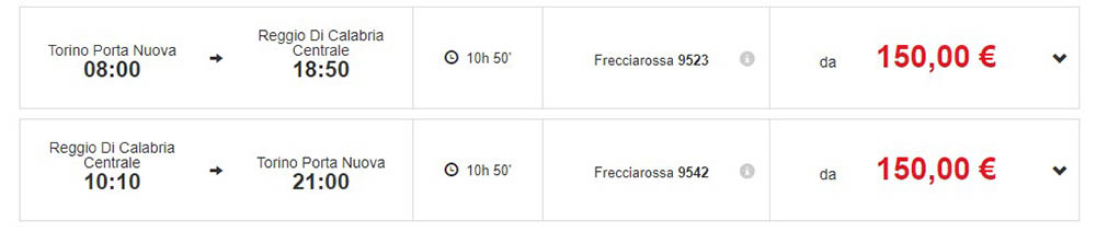 Il treno Frecciarossa 9523 lascerà Torino Porta Nuova alle 8.00 per giungere a Reggio Calabria alle 18.50 con fermate intermedie a Torino Porta Susa, Milano Centrale, Milano Rogoredo, Reggio Emilia AV, Bologna Centrale, Firenze S. M. Novella, Roma Tiburtina, Roma Termini, Napoli Afragola, Napoli Centrale, Salerno, Paola, Lamezia Terme Centrale, Rosarno e Villa S. Giovanni.