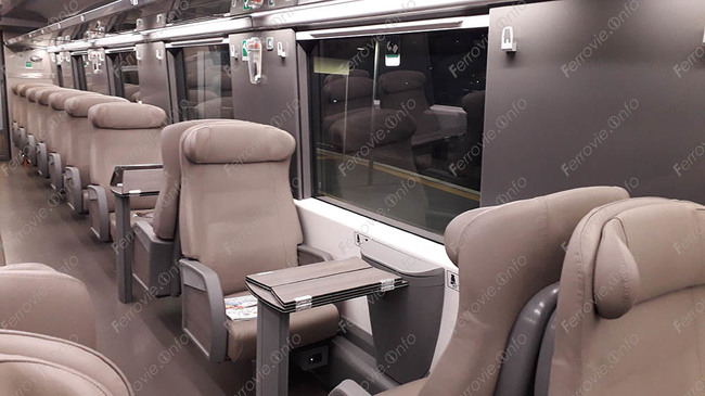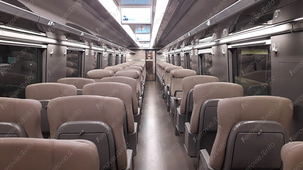 Salgo a bordo e raggiungo la vettura n.1, dove ho il posto riservato. Il treno è intonso e si presenta in ottime condizioni di ordine e pulizia, mentre si avverte ancora chiaramente l'odore tipico di "nuovo".
