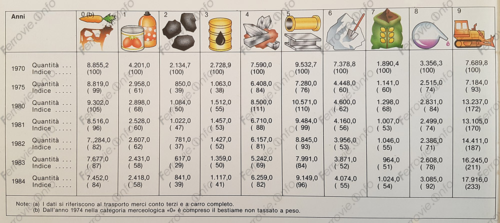 Come si vede da questi dati e si evince ancora più chiaramente dalla tabella sottostante, il trasporto merci su rotaie si evolve ma in qualche modo anche si riduce, con un andamento che ha lasciato strascichi anche in tempi recenti. Questo lo si deve, in quegli anni, soprattutto alla crescita del sistema di autostrade e alla diffusione dei trasporti su gomma che vengono incentivati a discapito della ferrovia.