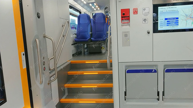 Le porte di accesso, due per lato su ogni cassa sono a battente unico, a scorrimento, in un vistoso colore giallo intenso, con la pedana che “tappa il buco” tra il treno ed il marciapiede della stazione.